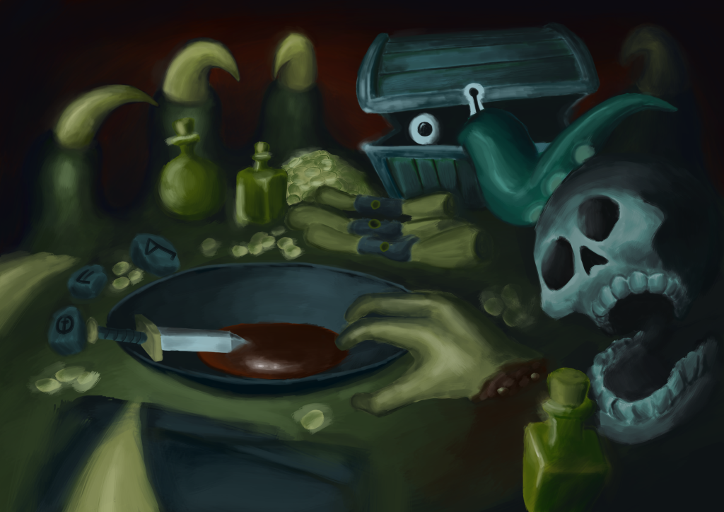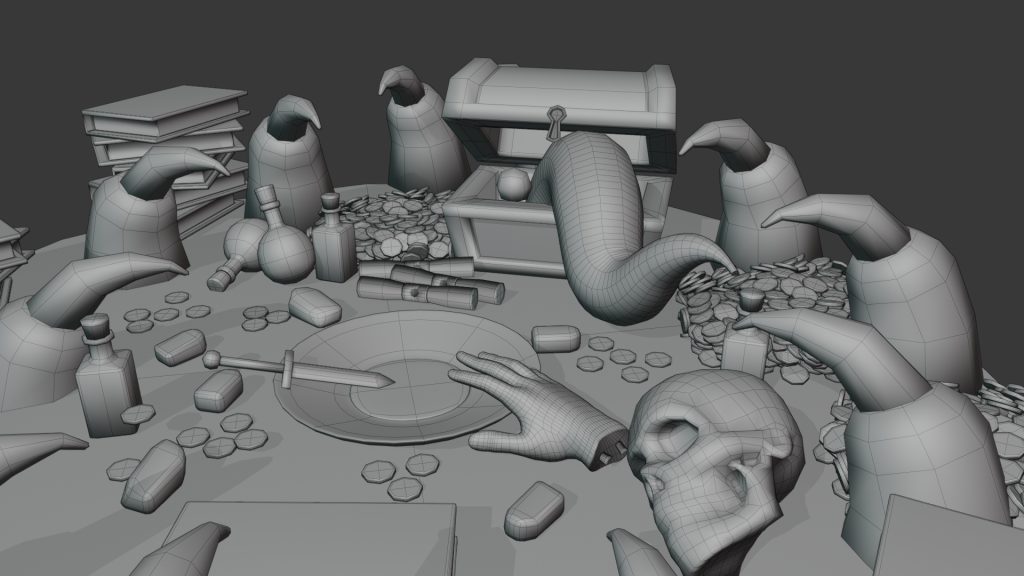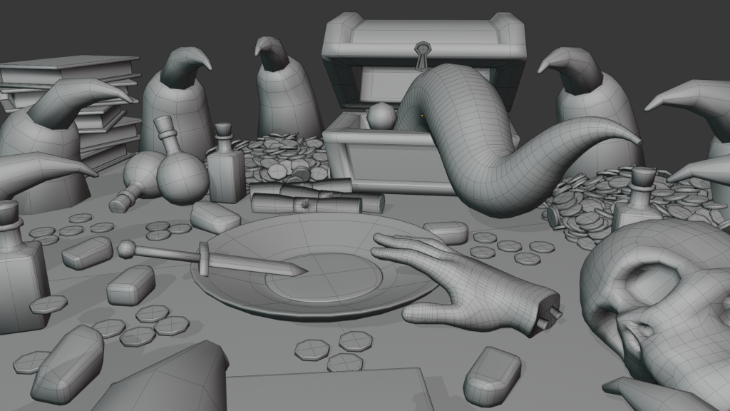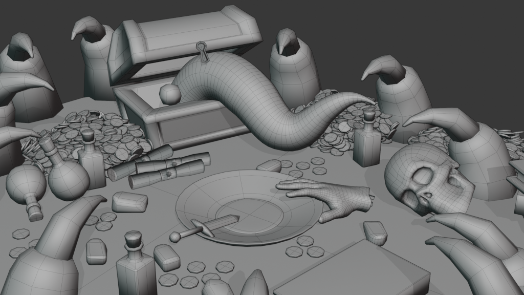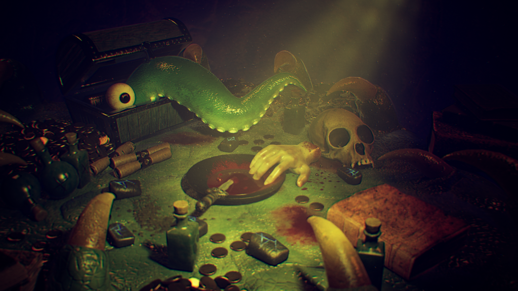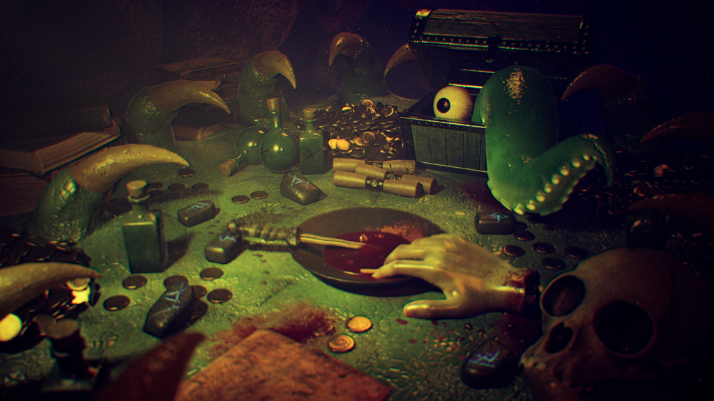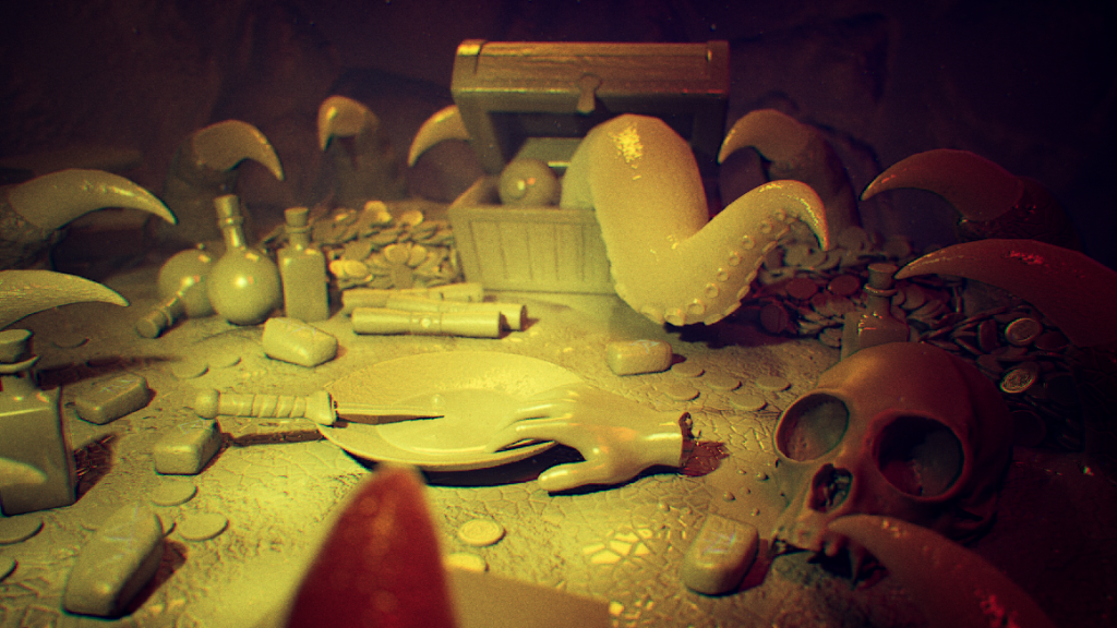 Created all of the 3D models using Blender and rigged and animated the chest and tentacle using Maya.